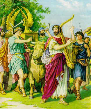 6:12And it was told king David, saying, Jehovah hath blessed the house of Obed-edom, and all that pertaineth unto him, because of the ark of God. And David went and brought up the ark of God from the house of Obed-edom into the city of David with joy. 6:13And it was so, that, when they that bare the ark of Jehovah had gone six paces, he sacrificed an ox and a fatling. 6:14And David danced before Jehovah with all his might; and David was girded with a linen ephod. 6:15So David and all the house of Israel brought up the ark of Jehovah with shouting, and with the sound of the trumpet.