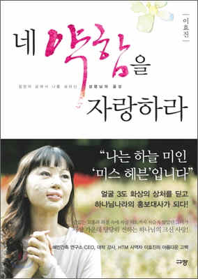![]() ● 네 약함을 자랑하라 이효진 저 | 규장 정가 10,000원 출간일 2009년 10월 12일 232쪽 | 340g | 128*188mm ISBN-13 9788960971394 ▶ 지은이 소개 - 저 : 이효진 세 살 때 아궁이에서 끓고 있던 주전자를 엎어 얼굴과 왼손에 3도 화상을 입었다. ‘파충류 괴물 같다’고 놀리는 아이들 때문에 늘 땅만 보고 다녔다. 스무 살이 되면 수술을 받고 나을 수 있다는 엄마의 말을 믿고 예뻐진 스무 살의 자신을 만나기 위해 어린 나이로는 감당하기 힘든 고통의 시간을 견뎠다. 그러나 대학에 입학하고 수술이 불가능한 상태인 것을 알게 되자 하나님을 떠나 절망과 좌절로 자살을 시도하기도 했다. 외모 지상주의의 세상 문화 속에 고통스러운 나날을 보내며 폭식증, 일중독, 드라마 중독에 빠져 지냈다. 인테리어디자이너의 꿈을 키우며 힘겹게 하루하루를 보내던 중 누구보다 사랑했던 엄마의 갑작스런 죽음으로 다시 하나님께로 돌아갔다. 하지만 황폐한 신앙생활과 고단한 일상의 곤고함 가운데 친구의 권유로 손기철 장로의 월요말씀치유집회에 참석하게 되어 성령님을 만났다. 진정한 하늘 미인 ‘미스 헤븐Miss heaven’이라는 성령님의 사랑의 음성을 들으며 깊은 내면의 상처가 치유되고 완전히 새로운 삶을 살게 되었다. 아름다운 얼굴은 잃었지만 대신 얻은 하나님의 크신 사랑과 은혜를 땅끝까지 이르러 전할 새로운 꿈을 꾸기 시작했다. 하나님께서 주신 영감과 아이디어로 디자인하는 ‘최고의 인테리어디자이너’이자, 수로보니게 여인처럼 예수님을 감동시키는 ‘믿음의 여인’이 되기를 원하는 그녀는 숙명여대와 중앙대 건설대학원을 졸업하고, 현재 예인건축연구소의 대표, 백석대 기독교인테리어디자인학과 강사, HTM의 사역자로 섬기고 있으며, 온누리교회에 출석하고 있다. ▶ 책 소개 얼굴 3도 화상의 상처를 딛고 하나님 나라의 진짜 미인이 된, 이효진의 신앙 에세이. 세 살 때 끓고 있던 주전자를 엎어 얼굴과 손에 3도 화상을 입은 저자는 외모를 중시하는 사회 문화 속에서 소외되어 절망과 좌절의 나날을 보냈다. 하나님을 떠나 음식중독, 일중독, 드라마중독에 빠졌으며, 자살을 시도하기도 하였다. 하지만 황폐한 신앙생활과 고단한 일상의 반복인 삶의 곤고함 가운데 2008년 초 친구의 권유로 손기철 장로님의 월요말씀치유집회에 처음 참석하게 되어 성령님을 만났다. 성령님의 사랑의 음성을 들으며 깊은 내면의 상처가 치유되고 완전히 새로운 삶이 시작되었다. 책의 제목이기도 한 '네 약함을 자랑하라'는 그녀가 기도 중에 얻은 응답이다. 이후 그녀는 비록 아름다운 얼굴은 잃었지만 대신 얻은 하나님의 크신 사랑과 은혜를 사마리아와 땅끝까지 이르러 주의 증인이 되고자 결심하였다. 이 책은 30년간 그녀를 괴롭혀온 화상의 상처를 이겨내고 하나님 나라를 알리는 '미스 헤븐'이 된 이효진 사역자의 아름다운 고백을 담고 있다. “나는 하나님나라 ‘미스 헤븐’입니다” 얼굴 3도 화상의 상처를 딛고 하나님나라의 홍보대사가 되다! 끝없는 고통과 좌절 속에 자살 시도까지 서슴지 않았던 그녀가 세상 가운데 당당히 전하는 하나님의 크신 사랑! 예인건축연구소 CEO, 대학 강사, HTM 사역자 이효진의 아름다운 고백 세상에서 가장 낮고 천한 자를 찾아오신 하나님을 향한 멈출 수 없는 감사와 찬양의 고백! “예수님이 없는 깨끗한 얼굴보다, 예수님 있는 화상 얼굴을 택하겠습니다” 이 책은 세 살 아기 때 끓는 주전자를 엎어 얼굴에 3도 화상을 입었지만 하나님을 깊이 만남으로써 상처를 극복하고, 자신을 ‘하나님나라 미스 헤븐’이라고 당당하게 소개하는 이효진 씨의 희망 고백록이다. 건축 인테리어디자이너인 저자는 최근 H건설의 대형 프로젝트 설계자로 선정된 예인건축연구소의 소장(CEO)이며 백석대 ‘교회 인테리어’ 강사로, 그리고 저자가 성령 하나님을 만날 수 있도록 인도한 월요말씀치유집회(HTM, 대표 손기철 장로)의 봉사자 등으로 행복한 삶을 영위하고 있다. 그러나 불과 몇 해 전까지만 해도 평생을 괴롭혀온 화상의 상처 때문에 폭식증과 일중독에 시달리기도 하고 심지어 자살을 시도한 적도 있었다. 그랬던 그가 하나님을 만나고 진정한 사랑을 깨닫게 되고, 특히 신약성경의 대부분을 쓴 바울 사도가 고백했던 것처럼(고린도후서 12장 9절), “네 약함을 자랑하라”는 성령 하나님의 말씀을 따라 자신을 평생 괴롭혔던 화상의 상처를 오히려 자랑함으로써, 오히려 하나님나라를 전하는 홍보대사가 되었다고 고백한다. 화상 입은 외모는 그의 약함이 분명하지만, 오히려 그것을 자랑할 때 그리스도의 능력이 그에게 머물게 되었다고 자랑한다. 저자는 이렇게 말한다. “다시 태어나도 하나님의 선택받은 자녀로 태어나고 싶습니다. / 만약 화상을 입지 않고 정상적인 모습으로 살다가 예수님을 만나지 못하고 지옥에 간다면 / 나는 차라리 지금의 삶을 택하고 싶습니다. / 예수님 없는 내 삶은 지옥이었습니다. / 예수님 없는 다치지 않은 얼굴과 예수님을 만난 화상 입은 얼굴 / 두 가지 중 하나를 택하라고 한다면 / 나는 후자(後者)를 선택할 것입니다.”(본문에 수록된 저자의 기도문 중에서)