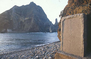독도의 두 섬 중 동도 해안에 세워진 비석. ‘대한민국 경상북도 울릉군 독도’라는 글귀가 선명하다. 1950년대 일본이 독도를 침범해 일본 영토라는 나무 표지를 세우자 한국은 이를 뽑아낸 뒤 바위 등에 ‘한국령’이라는 표지를 새기고 이 비석을 세웠다.-