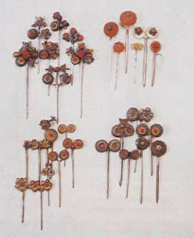 이 뒤꽂이는 조선시대 후기의 것으로 여인들이 뒷머리를 장식하기 위해 사용한 장신구이다. 뒤꽂이의 대는 은이나 놋 등으로 만들고, 머리 부분은 비취, 옥, 산호, 진주 등으로 봉황, 연봉, 꽃, 나비, 천도복숭아 등을 형상한 장식으로 꾸몄다.