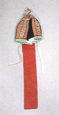 굴레의 겉천 색상은 대개 자주색, 검은 색과 같은 진한 색으로 하였고, 안은 주로 붉은색으로 하였다. 이 비단가닥에는 십장생무늬를 비롯하여 상서로운 의미의 글자무늬를 화려하게 수놓았으며, 양 측면에 단 장식띠에도 수를 놓거나 술장식으로 곱게 꾸몄다. 이러한 굴레는 첫돌이나 그밖의 명절에 예복차림시 사용하였다. (길이 24cm)