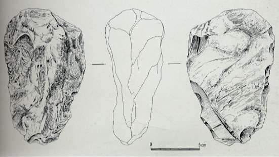 넓적한 때림면의 한 곳에는 때려낸 자리가 있고, 깨진 면에는 불루기가 아래 위에 2개 생겼다. 이 석기는 양쪽에 날이 서고 끝이 뾰족하여 땅을 파고 자르거나 찍는 데 사용하였을 것이다. 구석기시대 전기에서도 이른 시기의 노동도구였다.