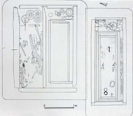 무덤에서는 긴 쇠칼, 쇠단검, 짧은 쇠칼, 쇠뇌, 창고달이 있는 창 등의 강철제 무기류와 활, 화살, 5쌍의 청동제 수레굴대끝을 비롯한 5대분의 수레부속품, 6개의 금동 말관자와 200여 개의 금동말굴레 장식품, 그리고 금판과 보석으로 장식한 띠고리, 칠기류, 청동거울, 화분형단지와 배부른 단지, 그밖에 여러 가지 치렛거리(장신구) 등 700여 점의 유물이 나왔다.