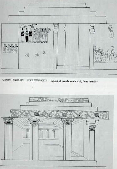 안칸은 앞칸보다 0.2m 높다. 회랑은 안칸의 동쪽과 북쪽을 ㄱ자로 싸고 돌았다. 천장형식은 평행삼각고임인데 회랑 만은 평행고임이다. 동서 두 곁칸과 안칸, 그리고 회랑에는 문이 없고 그 대신 돌기둥들을 세워 입구를 표시하였다. 두 곁칸과 회랑 입구에는 2개의 4각 기둥을 세웠고 안칸 남쪽에는 3개의 8각기둥을 세웠다. 기둥 돌 위에는 첨차(제공)나 주두를 올려 놓았다. 이렇듯 지하궁전을 방불케하는 무덤칸의 복잡한 구조는 고구려 왕족 및 귀족들의 웅장하고 화려한 주택을 그대로 옮겨다 놓으려는 데서 온 것이다.