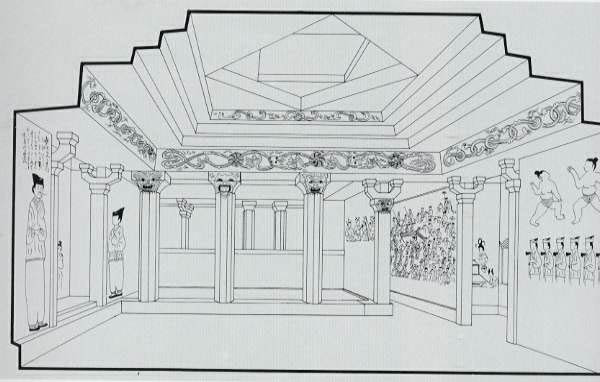 안칸은 앞칸보다 0.2m 높다. 회랑은 안칸의 동쪽과 북쪽을 ㄱ자로 싸고 돌았다. 천장형식은 평행삼각고임인데 회랑 만은 평행고임이다. 동서 두 곁칸과 안칸, 그리고 회랑에는 문이 없고 그 대신 돌기둥들을 세워 입구를 표시하였다. 두 곁칸과 회랑 입구에는 2개의 4각 기둥을 세웠고 안칸 남쪽에는 3개의 8각기둥을 세웠다. 기둥 돌 위에는 첨차(제공)나 주두를 올려 놓았다. 이렇듯 지하궁전을 방불케하는 무덤칸의 복잡한 구조는 고구려 왕족 및 귀족들의 웅장하고 화려한 주택을 그대로 옮겨다 놓으려는 데서 온 것이다.