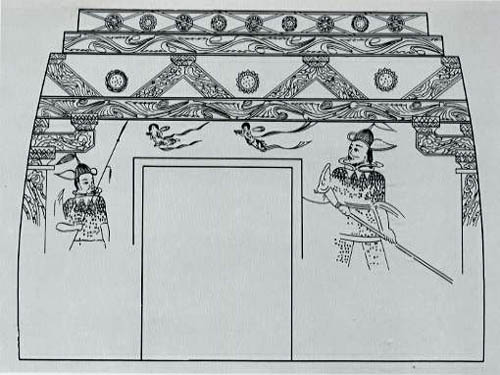 안길 좌우 벽에는 문지기장수와 창을 잡은 무사들의 대열이 그려 있으며, 안칸 남벽 입구 좌우에는 문지기, 입구 위에는 비천, 동벽에는 연꽃을 뿌리는 인물과 비천, 서벽에는 여인과 아이들의 군상, 북벽에는 주인공의 실내생활을 그렸다.