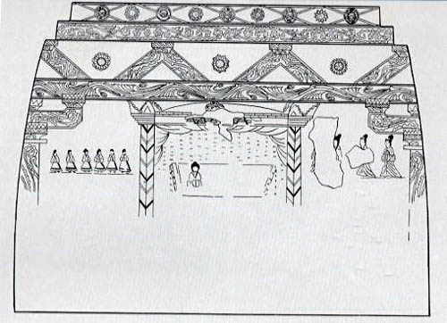 안길 좌우 벽에는 문지기장수와 창을 잡은 무사들의 대열이 그려 있으며, 안칸 남벽 입구 좌우에는 문지기, 입구 위에는 비천, 동벽에는 연꽃을 뿌리는 인물과 비천, 서벽에는 여인과 아이들의 군상, 북벽에는 주인공의 실내생활을 그렸다.