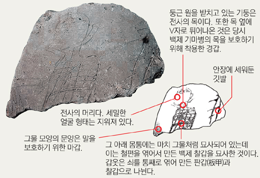 우물터 내부 퇴적층에서 출토된 백제시대 기와 조각에는 투구와 갑옷을 입은 전사가 마갑(馬甲·말 갑옷)을 쓴 말 위에 앉아 있는 기마병의 모습이 담겨 있다. 전사는 목을 보호하는 V자 형태의 경갑(頸甲)을 착용하고, 몸통에는 철편을 엮어서 만든 찰갑(札甲)을 입고 있다.
