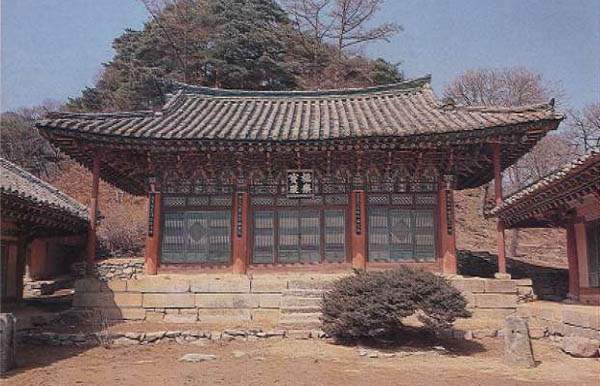 두공의 이러한 구조와 함께 건물내부 뒷면의 일부 액방(창방)과 탱화가 걸린 은폐된 부분에 남아 있는 단청은 조선시대 초기 건물로서의 특색을 뚜렷이 보여 준다. 처마는 길게(2.5m) 내뽑고 추녀에는 받침기둥(활주)을 세웠다. 건물의 정면은 화려한 꽃살문 대신 기둥 위에 문인방을 건너지르고, 아래에는 세살문을, 위에는 방형의 격자살로 된 뙤창을 설치하였는데 후기의 것으로 보인다.