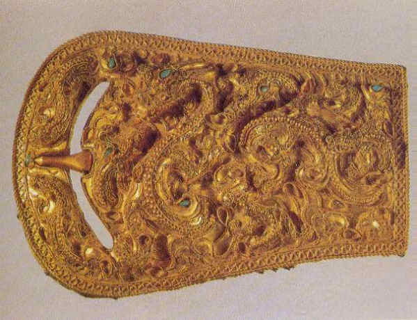 이 가운데서 특히 주의를 끄는 것이 순금판 위에 7마리의 용을 세련된 솜씨로 장식한 순금띠고리(금제대구)이다. 우선 금실로 띠고리의 테두리를 장식한 다음 누금기법으로 용을 형상하였는데, 용의 등부분에는 굵은 금알을 붙이고 그밖의 부분에는 작은 금알을 붙였다. 그리고 통과 통 사이의 공간에는 꽃잎모양의 테두리를 만들고 그 안에 푸른 색 비취옥을 박아 놓음으로써 장식적 효과를 더욱 배가시켰다. 띠고리의 머리 부분은 겉쇠를 달아 혁띠를 걸 수 있도록 만들었다. 이러한 형태의 띠고리는 정백동 37호무덤을 비롯한 나무곽무덤에서도 나왔는데 이 모든 유물들이 당시의 문화적 수준이 상당히 높았음을 보여주는 것이다.
