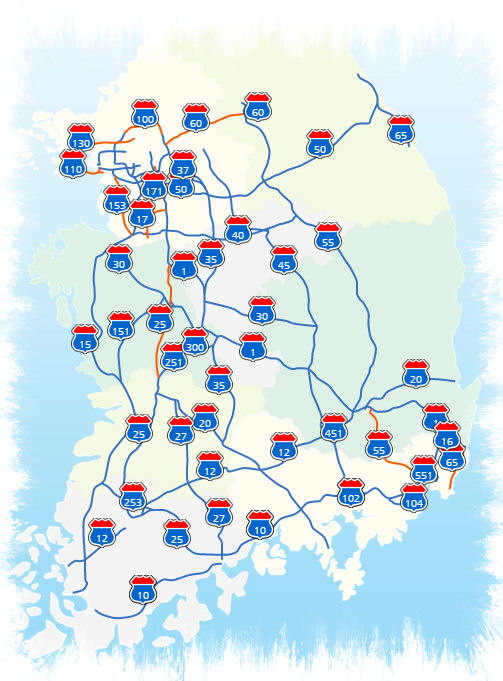 1 경부선 10 남해선 12 무안광주ㆍ광주대구선 15 서해안선 휴게소 16 울산선 20 익산포항선 25 호남선 27 순천완주선 30 당진영덕선 35 중부선, 통영대전선 37 제2중부선 40 평택제천선 45 중부내륙선 50 영동선 55 중앙선 60 서울양양선 65 동해선 100 서울외곽순환선(퇴계원~일산) 102 남해제1지선 104 남해제2지선 110 제2경인선 120 경인선 151 서천공주선 251 호남선의지선 253 고창담양선 300 대전남부순환선 451 중부내륙선의지선 551 중앙선의지선 |