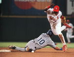 Los Angeles Dodgers' Gary Sheffield is safe at second while St. Louis Cardinals shortstop Edgar Renteria watches the baseball during the fourth inning at Busch Stadium in St. Louis on Friday, May 14, 1999. Sheffield was safe at second on a ground ball hit by Raul Mondesi to Cardinals second baseman Joe McEwing, who made the toss to Renteria covering the base. Renteria dropped the ball, and both runners were safe. The Dodgers won 7-3. (AP Photo/Leon Algee) St. Louis rallied for four runs in the sixth to take the lead for good. Lankford, Tatis and Eric Davis all singled off Park to open the inning and make it 4-2 before Drew and Dunston came through with clutch hits. "My fastball was good today, but they hit a couple of changeups and breaking balls," Park said. "I just missed on the changeup later in the game. I was just missing. I shouldn't throw two straight offspeed pitches." Trying to turn a double play in the seventh, second baseman Eric Young threw away the relay and Lankford scored for a 6-4 lead. "It was a huge win. J.D. came off the bench and