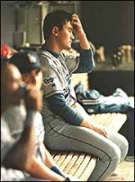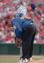 Los Angeles Dodgers starting pitcher Chan Ho Park holds on to Dodgers trainer Charlie Strasser as Strasser cleans the dirt off Park's spikes during the first inning against the St. Louis Cardinals, Saturday, May 15, 1999, at Busch Stadium in St. Louis. (AP Photo/Mary Butkus) ¡¡°á±¹ Áö³ 4³âµ¿¾È Á÷±¸¿Í Ä¿ºê¸¸ ´øÁø ¹ÚÂùÈ£ÀÇ Åõ±¸³»¿ëÀº ¸ÞÀÌÀú¸®±× ŸÀڵ鿡°Ô ¼ÛµÎ¸®Â° ³ëÃâµÆ°í ¹ÚÀº À¯¸®ÇÑ º¼Ä«¿îÆ®¸¦ Àâ°íµµ °áÁ¤±¸¸¦ ´øÁöÁö ¸øÇÏ´Â »óȲÀÌ´Ù. ¡¡Áö³ °Ü¿ï ¹ÚÂùÈ£ÀÇ ¹«¸®ÇÑ ÀÏÁ¤µµ ºÎÁøÀÇ ¿äÀÎÀ¸·Î ÁöÀûµÇ°í ÀÖ´Ù. ¡¡¹ÚÂùÈ£´Â ÈÞ½ÄÀ» ÃëÇØ¾ß ÇÏ´Â °Ü¿ï µ¿¾È º´¿ªÀ» ¸éÁ¦¹Þ±â À§ÇØ ¹æÄÛ ¾Æ½Ã¾È°ÔÀÓ¿¡ ÃâÀüÇß°í Çѱ¹¿¡ µ¹¾Æ¿Í¼µµ °¢Á¾ Çà»ç¿¡ Âü¼®ÇÏ´À¶ó ÇǷΰ¡ ´©ÀûµÆ´Ù. ¡¡´õ±¸³ª ¹ÚÂùÈ£´Â ½ºÇÁ¸µÄ·ÇÁµ¿¾È 5Â÷·Ê ½Ã¹ü°æ±â¿¡¼ ¹æ¾îÀ² 0.78ÀÇ »©¾î³ ¼ºÀûÀ» °Åµ×´Âµ¥ À̶§ Áö³ªÄ¡°Ô ÆäÀ̽º¸¦ »¡¸® ²ø¾î¿Ã¸° °ÍÀ¸·Î º¸ÀδÙ. ¡¡´ëºÎºÐ ¸ÞÀÌÀú¸®±× Åõ¼öµéÀÌ Á¤±Ô½ÃÁð °³¸·¿¡ ¸ÂÃç ÀÚ½ÅÀÇ ÆäÀ̽º¸¦ Á¶ÀýÇÏ´Â ¹Ý¸é ¹ÚÂùÈ£´Â ÇǷΰ¡ ¹Ìó °¡½ÃÁö ¾ÊÀº »óÅ¿¡¼ Àǿ常 ¾Õ¼ ÄÁµð¼Ç Á¶Àý¿¡ ½ÇÆÐÇßÀ» °¡´É¼ºÀÌ Å©´Ù. ¡¡¹ÚÂùÈ£°¡ 5ȸ ÀÌÈÄ °©Àڱ⠳Ÿ´çÇÏ´Â ÀÌÀ¯µµ °Ü¿ï ÈÆ·Ã ½ÇÆÐ·Î ÀÎÇÑ Ã¼·Â ÀúÇϷΡ¡Ç®À̵ǰí ÀÖ´Ù. ¡¡96³âÀÌÈÄ ½Â½ÂÀ屸¸¦ °ÅµìÇß´ø ¹ÚÂùÈ£°¡ ¸ÞÀÌÀú¸®±×¿¡¼