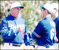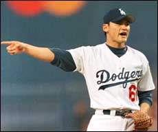 Los Angeles Dodgers pitcher Onan Masaoka, center, places Seattle Mariners' Damaso Marte in a headlock as Ismael Valdes of the Dodgers, left, and Jamie Moyer of the Mariners attempt to pull Marte away during a sixth-inning bench-clearing brawl in Los Angeles, Sunday, July 11, 1999. A brushback pitch by Seattle's Frankie Rodriguez triggered the brawl. The Dodgers won 13-4. (AP Photo/E.J. Flynn) "I love hitting here," said Karros. "This is a great place to hit, not only for home runs, but anything, because the outfield is so big. It's a great place to hit." Park also helped his cause by driving in two runs as Los Angeles won for only the second time in its last 11 games. The Dodgers jumped on top by scoring five times in the first inning off former teammate Brian Bohanon. Adrian Beltre worked out a bases-loaded walk, Mark Grudzielanek cleared the bases with a double and Park capped the inning with an RBI single. Grudzielanek went 3-for-4 with two runs scored and is 5-for-10 since returning from the disabled list on Tuesday. Park (5-7) snapped a six-start winless streak, despite allowing seven runs and 10 hits in five innings. "I don't feel real good because I gave up seven runs," said Park. "But finally I can sleep tonight because I won. My teammates helped me out."