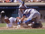 Los Angeles Dodgers' Eric Young is tagged out at home plate by Chicago Cubs catcher Jeff Reed during the fifth inning Saturday, Aug. 28, 1999, in Los Angeles. (AP Photo/Mark J. Terrill) Karros and Sheffield homered to back a strong effort by Chan Ho Park as the improving Dodgers rallied for a 4-3 victory over the reeling Cubs. Sosa, the lone bright spot in a dismal season for the Cubs, had a pair of RBI but did not homer for the second straight game. He remained at 53 homers, two ahead of St. Louis slugger Mark McGwire for the major league lead. Although Dodgers sluggers Karros and Sheffield have less homers combined than Sosa, they powered Los Angeles to its seventh win in nine games. Karros hit his 28th homer in the second, cutting a 2-0 deficit in half. His drive to right field bounced off Sosa's glove and over the fence. The Dodgers added another run in the second on Adrian Beltre's groundout and took the lead for good in the third on Sheffield's 22nd homer, a two-run shot off starter Andrew Lorraine (1-3). Park (8-10) won for the first time in 13 starts at home this year. He had been 0-6 at Dodger Stadium but overcame a rough start to allow three runs -- two earned -- and seven hits in eight innings, his longest stint of the season. The Korean righthander walked two and struck out six before giving way to Jeff Shaw, who worked the ninth for his 28th save in 32 opportunities. Pinch-hitter Gary Gaetti flied out to the warning track with a man aboard to end the game and send the Cubs to their sixth loss in seven games. Sosa has 13 homers this month to move past McGwire but that has not prevented the Cubs from tumbling to the worst August in club history at 5-21. updated at Sat Aug 28 16:03:40 1999 PT