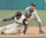 Los Angeles Dodgers shortstop Alex Cora, right, attempts to tag out Florida Marlins' Luis Castillo at second base after Castillo attempted to steal Wednesday, Sept. 8, 1999 at Pro Player Stadium in Miami. Castillo was safe, racking up his 50th stolen base this season. (AP Photo/Wilfredo Lee) Masaoka struck out Kevin Orie for the first out, but Kotsay finally ended the marathon by lacing a flyball to deep right-center field that scored Berg with the winning run. "It was a great day," Marlins manager John Boles said. "If you win this game it's terrific. Lose it, and it's one of the worst games you could imagine." Florida used a club-record 25 players in the game while finishing 7-2 against the Dodgers this season. "It's a long game and we don't want to lose," Wilson said. "There's no time clock in baseball." Rafael Medina (1-0) worked the top of the 13th for the win. The Dodgers had taken a 4-3 lead in the top of the 12th. Adrian Beltre led off with a double against Antonio Alfonseca and later scored on a groundout by Vizcaino. But just as they did in the bottom of the ninth, the Marlins kept the game going when Wilson smacked a leadoff homer off Alan Mills. Wilson leads all rookies with 23 homers. The Marlins squandered a chance to win the game later in the inning. They loaded the bases with one out to chase Mills before Masaoka struck out Todd Dunwoody and Alex Gonzalez. Dunwoody was hit with a 2-2 pitch, but swung and missed for the third strike. With the score tied, 2-2, the Dodgers went ahead in the ninth against Braden Looper on a sacrifice by pinch-hitter Dave Hansen. The Marlins rallied to send the game into extra innings against closer Jeff Shaw. Dunwoody singled with one out and moved to second when left fielder Todd Hollandsworth bobbled the ball. Gonzalez followed with a single up the middle, scoring Dunwoody. Hollandsworth and Beltre had three hits apiece for the Dodgers, who must fly across country to open a four-game series against the New York Mets on Thursday night. "That was a strange one. I mean, it's tough," Dodgers manager Davey Johnson said. "That's South Florida during hurricane season." After the game finally started, the Marlins tallied a run in the opening inning against Los Angeles starter Chan Ho Park on Kotsay's one-out single. Los Angeles quickly struck back in the next frame off Marlins starter Michael Tejera, who was making his major league debut. Hollandsworth and Beltre singled with one out, settting the stage for Paul Loduca's two-run single. Tejera, a 22-year-old lefthander, left after two innings and allowed two runs and five hits. Florida tied the score in the second. Castillo drew a one-out walk, stole second and scored on Cliff Floyd's single. Castillo's stolen base was his 50th of the season. He became the third Marlin in club history with at least 50 steals in a season. However, that stolen base may have been Castillo's last of the season. He suffered a dislocated left shoulder while diving for a grounder by Hollandsworth in the ninth and is sidelined indefinitely. updated at Wed Sep 8 21:44:18 1999 PT = Yahoo