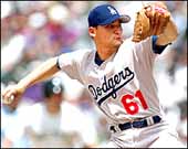 Los Angeles Dodgers pitcher Chan Ho Park delivers a pitch in the sixth inning against the Houston Astros Saturday, Oct. 2, 1999, in Houston. The Astros won, 3-0. (AP Photo/Pat Sullivan) Lima pitched 7 2/3 scoreless innings and combined with Billy Wagner on a nine-hitter as the Astros blanked the Los Angeles Dodgers, 3-0, in the penultimate regular season game at the Astrodome. The Astros moved one game ahead of the Cincinnati Reds in the National League Central and will have the opportunity to clinch their third straight division title Sunday at the Astrodome, baseball's first indoor facility dubbed the world's eighth wonder when it opened in 1965. Cincinnati lost to Milwaukee earlier today. "We're not nervous. We're not pressing and I don't think mentally we're any different on the field," Houston manager Larry Dierker said. "But today I do think we're more pumped up because we won and Cincy lost." Houston also stayed one ahead of the New York Mets in the wild card race. The Mets defeated Pittsburgh tonight, preventing the Astros from clinching a playoff berth. A 5-1 loss to the Dodgers on Friday night made today's game a critical one. "As bad as we played last night, we just played that much better today," Houston's Jeff Bagwell said. "It was a big win because now we're in a position we want to be in." Craig Biggio homered to snap a sixth-inning tie and pinch-hitter Bill Spiers delivered a two-run single in the eighth to give Wagner a cushion. It was just the fifth triumph in 14 games for the Astros since a club record 12-game winning streak. Desperate for a win, manager Larry Dierker went to Lima (21-10) on three days rest for just the third time this season and the righthander has won each time. Lima snapped a personal three-game losing streak, scattering seven hits while walking two and striking out eight. He tied teammate Mike Hampton for the NL lead and team record in wins. Prior to the game, the umpires checked a stain on Lima's pants for pine tar but found nothing illegal. "It made me mad but this is what I say to that: If I'm cheating, then they're not going to hit me at all," Lima said. With the volatile Lima taking his celebrated role as dugout cheerleader, Wagner allowed a single to put runners on first and third before getting Raul Mondesi to hit into a force play to end the inning. The Los Angeles slugger failed to deliver two innings earlier, grounding into a force play with the bases loaded.