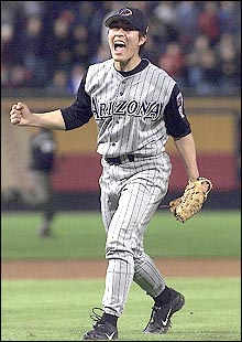 Left for dead three days ago, the Yankees are just one win away from becoming just the third team to win four straight World Series titles. But New York's 19th win in 22 World Series games and 10th straight at home was another for the ages. One night after Tino Martinez homered with two outs in the bottom of the ninth inning off Byung-Hyun Kim to erase a two-run deficit, Scott Brosius became the latest hero. With the Diamondbacks holding a 2-0 lead, Arizona manager Bob Brenly turned to Kim to start the ninth. Jorge Posada opened the inning with a double but the Korean sidearmer easily retired the next two batters. Brosius, just 3-for-16 in the series to that point, crushed a 1-0 pitch into the left-field seats to knot the game. "It seemed like the whole situation was set again and it happened again," Brosius said. "I definitely wasn't thinking that, I just wanted to hit it hard." "It's Groundhog Day," Yankees manager Joe Torre said. "I don't know what's going on. You're sitting there, you have another breath left and Brosius hits the ball out of the ballpark. I mean, you shake your head. ... I don't know, I really don't. I said I didn't know last night so it's just double that. If Wednesday's crowd was ecstatic, Thursday's was deafening as Brosius circled the bases. Kim, 22, who has surrendered three devastating homers in a span of 24 hours, dropped to a crouch and appeared to start crying on the mound as teammates consoled him. "Brosius had some good swings off him on Wednesday and he had confidence that he was going to get on," Yankees shortstop Derek Jeter said. "I talked to him at length this afternoon, called down to bullpen coach Glen Sherlock and asked how he was warming up and (he) said his stuff was electric," Brenly said. "He is our closer, he wanted the ball in that situation, made a bad pitch, a slider that hung over the inside of the plate to Scott Brosius." Kim was crestfallen after blowing his second straight World Series save opportunity. "I tried not to throw it the same as yesterday, but somehow things didn't go my way," Kim said. "Mentally and physically, I was ready. I feel sorry for the players and the manager." Brenly went to 42-year-old former Yankee Mike Morgan, who got Soriano to end the inning. The Yankees turned to postseason ace Mariano Rivera in the 10th, who nearly turned the game over to the Diamondbacks in the 11th. Danny Bautista opened with a single and took second on a bloop hit by Erubiel Durazo. After slugger Matt Williams sacrificed, Steve Finley was intentionally walked. With the bases loaded and one out, Reggie Sanders hit a liner up the middle that was gloved by Soriano. Mark Grace grounded out to third. "It was a huge play, obviously," Jeter said. "I don't think he hit it well." "I think it is just instinct and the desire to make the play," Soriano said through interpreter Leo Astacio. Sanders did not believe that Soriano was there to make the play. "I was very surprised to see them do that, to play double-play depth," Sanders said. "All I was trying to do was get the ball in play, to create a situation. I thought it was up the middle. It just goes to show you that everything Torre does at this point has been working for him." In the 12th, Arizona went to 19-game loser Albie Lopez (0-1), who surrendered a leadoff single to Knoblauch, his first hit in 14 at-bats in the series. Brosius sacrificed and Soriano followed with a single to right field. Catcher Rod Barajas could not handle Sanders' short-hop throw and the Yankees poured out of the dugout to mob Knoblauch. "I took a little peek to see if it was going to be close and it short-hopped the catcher," Knoblauch said. "I can run a little bit so I knew I had a good shot. But Sanders has a great arm. ... I can't imagine what they are going through. I'm sure it is tough but we know that they are not going away." "Last night I thought it would never happen again and it happens back-to-back nights," Soriano added. "There are really no words to describe it." Brenly was asked about the mystique, aura and supernatural powers of the American League champs. "I think that's cheapening what the Yankees are all about," he said. "They are a great baseball team. Trying to play it off to something supernatural I think takes away from the ability of these players. "I think just the fact that we've been involved in the last two games, especially, some of the most exciting baseball I've ever been a part of. Can't win'em all, we would like to win'em all, but the Yankees are very tough here in their house and we know that. They were tough again tonight. But it doesn't diminish what our team tried to do out there tonight or what the Yankees were able to do out there, it was just a great ballgame." The series shifts to Arizona for Game Six. The Diamondbacks will start Randy Johnson while the Yankees counter with Andy Pettitte. Johnson, probably headed for his third straight National League Cy Young Award, bested Pettitte in Game Two. The late-inning heroics overshadowed a phenomenal performance by Arizona starter Miguel Batista. Bypassed for the start in Game Four, Batista tossed 7 2/3 scoreless innings. He scattered five hits and five walks, striking out six. "My attitude is I want to pitch," Batista said. "I want to be out there the day after tomorrow. Hopefully Randy can go and throw a big game. If he doesn't, a lot of us are going to be in there. And the next day, I should be in there too." Yankees starter Mike Mussina nearly was as good. The veteran righthander allowed five hits -- including a pair of solo home runs in the fifth -- in eight innings. He walked three and struck out 10. One of the two solo homers hit in the fifth came off the bat of little-used backup Barajas. When starter Damian Miller was a late scratch with a strained right calf, Barajas -- a .160 hitter in the regular season -- was inserted into the lineup. "I've got a bunch of confidence," Barajas said. "I'm sure the veterans out here who have p