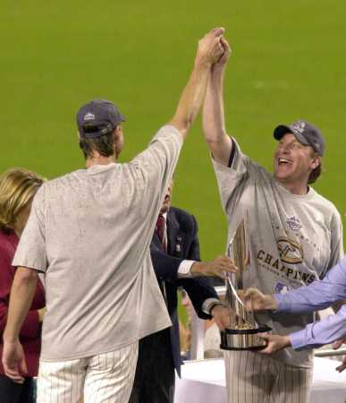 Luis Gonzalez capped the two-run rally with a bloop single into center field that scored Jay Bell with the winning run. Rivera (0-1) had converted 23 straight postseason saves and had struck out the side in the eighth, looking as untouchable as ever. Curt Schilling, who started Game Seven, and Randy Johnson, who finished it, split the Most Valuable Player award. Neither was beaten in the series, with Johnson winning both Games Six and Seven. Mark Grace opened the ninth with a single and Rivera committed an error as he inexplicably threw to second on a bunt by Damian Miller. Bell bunted and this time, Rivera did get the lead runner at third. But Tony Womack knotted the game with a double down the right-field line. Craig Counsell was hit by a pitch to load the bases, bringing up Luis Gonzalez, whose only contact in four at-bats was a broken bat. With the infield drawn in, Gonzalez looped a single into short center field for the game-winner. Rivera (0-1) is the all-time postseason leader in saves. He had not blown a postseason save since Game Four of the 1997 American League Division Series against Cleveland. As he did in the 1995 postseason against the Yankees, Johnson got the clinching win in relief. He pitched 1 1/3 scoreless innings to finish 3-0 with a 1.04 ERA in the World Series. He also became the first pitcher to win five postseason games in one year. Schilling was brilliant over 7 1/3 innings, although he was on the hook for the loss after allowing rookie Alfonso Soriano's go-ahead homer in the top of the eighth. He made three starts in the series -- the final two on three days' rest -- and gave up just four runs in 21 1/3 innings. It is the first major professional sports championship for the state of Arizona. The Diamondbacks won in just their fourth year and denied the Yankees their 27th world championship. updated at Sun Nov 4 21:30:33 2001 PT