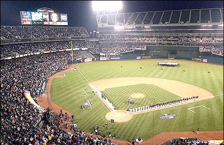 Unfortunately for the Rangers, once the game started, Oakland's timing problems ceased. In the A's 8-3 win, Oakland battered the remodeled Rangers pitching staff in a way reminiscent of last season. It was reminiscent because of just how overmatched the pitching staff looked. While Rangers ace-in-training Chan Ho Park struggled with making the adjustment to the American League, Oakland's Mark Mulder came within three outs of a complete game against the most feared lineup in baseball. "Everything is dictated by starting pitching," Rangers first baseman Rafael Palmeiro said. "There's was on tonight. Ours wasn't. When an ace pitcher brings his 'A' game, he is going to dominate even the best lineup in baseball." Park, the Rangers' key off-season pitching acquisition, got a rude welcome to the American League. He allowed six runs in five innings, including a pair of homers. When Park was removed in the sixth, three different relievers were handed a total of three inherited runners. Only rookie Colby Lewis, making his major league debut, managed to keep one from scoring. Todd Van Poppel, signed for three years at $7.5 million, allowed a run-scoring double to the first hitter he faced. Rich Rodriguez, acquired in the final week of spring training when general manager John Hart became disenchanted with the left-handers in camp, allowed a run-scoring single to a left-handed hitter. Allowing inherited runners to score was one of the bullpen's biggest faults last year. The Rangers allowed 109 inherited runners to score last year, most in the AL. And the vaunted offense? Well, the Nos. 2-6 hitters ? Carl Everett, Alex Rodriguez, Juan Gonzalez, Rafael Palmeiro and Ivan Rodriguez ?were a combined 3-for-19. Until Everett's ninth-inning homer, the lone hit was Gonzalez's infield single, which bounced off Mulder. Gonzalez also had an infield single in the ninth off reliever Chad Bradford. Mulder, who finished second in the AL Cy Young voting last year, hammered home a painful point for the Rangers. Good pitching still beats a good offense. And the pitching throughout the West is good. Park is expected to help the Rangers upgrade their pitching staff. It was not evident Monday. He allowed a single to Jeremy Giambi to start the bottom of the first and hit No. 2 hitter Randy Velarde on the back of the hand. He did escape the first without allowing a run, thanks in part to a double-play grounder. He was not as fortunate in the second. He allowed a homer to Eric Chavez on the first pitch. In the third, he allowed a leadoff single to Giambi, a run-scoring double to Frank Menechino, who replaced Velarde, and a homer to David Justice. When he was done, Park had done nothing to erase questions about his