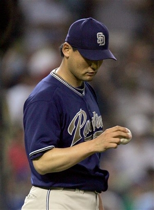 Diego Padres starting pitcher Chan Ho Park looks at a new ball after giving