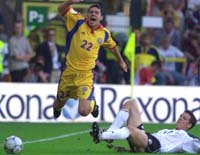 Romania stunned the Germans in the fifth minute when defender Thomas Linke failed to intercept a deep ball and allowed Adrian Ilie through to pass to the unmarked Viorel Moldovan in the goalmouth. The Romanian forward only had to tap it home. After creaking under Romanian pressure for 27 minutes, Germany hit back just as surprisingly when Mehmet Scholl sent a swerving 20-meter drive past the unsighted and flatfooted Bogdan Stelea, burying it in the top left corner. "That first goal shocked us," said German captain Oliver Bierhoff. In the battle of veterans Gheorghe Hagi and Lothar Matth?s, neither impressed. The 35-year-old Romanian made some dangerous moves early but tired quickly, while Matth?s, 39, mainly created danger for his own defense by playing out of position. "We played well and it was a great start to the tournament for us," said Hagi, draped in Matth?s' shirt after the game. In the other group A game England played Portugal in Eindhoven, Netherlands. "Romania had few chances and they came mostly as a result of our mistakes," said German coach Erich Ribbeck. "If you look at the whole game, the one point is justified. We played well in the first half-time and managed to draw level. In the second, some guys ran out of steam," he said. "At least in phases we showed that we can play good soccer and create chances," Ribbeck said. "It's quite possible that a couple of new players come in on Saturday," when Germany plays England, Ribbeck said. After the stunning opener, Romania continued to grip the Germans by the throat. Germany's vaunted organizaion was nowhere in evidence and Matth?s, supposedly the defensive master, was giving his team no leadership and even less direction. He wandered over much of the pith but was never in evidence to plug the huge holes that Romanians readily exploited. Up front too, he failed to make a contribution. Germany's defense basically came down to Jens Nowotny, who had all hands full correcting his teammates' mistakes. In front of a capacity 30,000-crowd at the Sclessin stadium, Germany was in total disarray for a half hour and goalie Oliver Kahn, was forced to make two dangerous forays well of his line to limit the early damage. In return, German action was limited to a powerful header from Oliver Bierhoff, which took an excellent reflex save from Stelea to deflect out of danger. Stelea was less lucky on Germany's equalizer. Scholl's goal changed the momentum of the game and Germany gradually started seeing more of the ball. But pushing forward, only left the German defense stretched to the limit. In the 41st minute, a deep ball from Hagi to Ilie yet again left the Germans exposed and Nowotny appeared to clip Ilie's foot in the penalty area. Hagi and Ilie were given both yellow for protesting Kim Milton Nielsen's controversial decision. "I won't comment on it," said Hagi with a wry smile. At half-time, Germany was extremely lucky to be still in with a shot at victory. And Bierhoff could have made the difference six minutes into the second half with another strong header, Stelea was beaten, but it clipped the outside of the post. From then on, the game settled into an untidy rhythm, with the German defense still struggling to get organized. "In the second half we started breaking out much better," said Oliver Bierhoff. But Romania remained dangerous. Moldovan should have gotten a second goal in the 68th minute. Iie had drawn Kahn from his line and when the ball bounced loose, Moldovan first shot weakly at a defender and sent the rebound wide. After Hagi was replaced in the 73rd minute, the tired, old master was left biting hs nails in the dugout. Matth?s too was substituted before the end. Lineups: Germany : Oliver Kahn; Markus Babbel, Jens Novotny, Lothar Matth?s, Thomas Linke (46, Marko Rehmer); Jens Jeremies, Christian Ziege, Thomas Haessler (73, Dietmar Hamann), Mehmet Scholl; Oliver Bierhoff, Paolo Rink. Romania: Bogdan Stelea; Gheorghe Popescu, Liviu Ciobotariu, Iulian Filipescu;