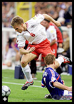 World champs cruise past Denmark 3-0 at Euro 2000 BRUGES, Belgium (AP) -- Thierry Henry scored a spectacular goal from Zinedine Zidane's defense-splitting pass as France opened its Euro 2000 account with a comprehensive 3-0 win against resolute but ineffective Denmark on Sunday. Veteran defender Laurent Blanc calmed the world champion's early anxieties with a 16th-minute goal but the injury-hit Danes still missed several good chances before the match was killed by the Arsenal forward's brilliant 65th-minute strike. World Cup winner Henry -- who only recently broke back into the French team after an 18-month absence -- latched on to a pass from the superb Zidane wide on the left and charged 50 meters before curling the ball past veteran Danish 'keeper Peter Schmeichel. In injury time Patrick Vieira broke unmarked down the right and squared the ball for substitute Sylvain Wiltord to score an easy third although the Bordeaux forward had clearly been offside in the buildup. "It is a good start but the match was not easy because the Danes were very tough. We needed to be very strong mentally to go through," said French coach Roger Lemerre. "Even if we are world champions we have to begin again here." France, which beat Denmark on the way to winning the European crown in 1984, had a shaky start but, as the match wore on, was able to rely on its classy defense. Danish fans at the compact 30,000 Jan Breydel Stadium in Bruges could have seen the 1992 European champion go ahead as early as the second minute. Jon Dahl Tomasson was sent clean through after a Marcel Desailly slip but with only Fabien Barthez to beat could only look on in despair as the shaven-headed goalkeeper kicked away his shot. "That could have changed the game," Schmeichel said. "I thought 3-0 didn't reflect the play. We were not played off the pitch." "I thought we controlled the game for some time, but we have a lot of work to do this week," the Sporting Lisbon and former Manchester United goalkeeper said. Early on, France's normally solid defense looked in disarray against Denmark's direct approach play. A poor headed clearance by Lilan Thuram in the 12th minute presented Ebbe Sand with a good chance from 15 meters but the Schalke striker was thwarted by Barthez. At the other end, Nicolas Anelka spurned a great 12th-minute opportunity, collecting an intelligent Zidane pass but shooting wide of an empty net after rounding Schmeichel. But France soon broke through. Inter Milan defender Blanc started off a slick four-man which sent Anelka clear through the center. In panic, Schmeichel came rushing out at the striker's fee but failed to hold the ball and Blanc, making an intelligent run down the inside right channel, slid the ball into the open net. It was the 16th goal for France from he 34-year-old, who plans to retire from international soccer after Euro 2000. The goal steadied the world champion but Denmark's midfield showed superb workrate, with Stig Tofting battling to thwart the supply line to Zidane. Eight minutes into the second half, Barthez could only parry a long range Tofting free kick. The ball fell kindly to Morten Bisgaard, but the Udinese midfielder hesitated in the six-yard area. Henry and Anelka had never played together for France before this month but began to cause problems for the Danes on the counterattack. And, with Zidane on the field, danger was always lurking. In the 57th minute, the Juventus playmaker sent Henry through and the Arsenal forward tried a fancy lob when a booming drive was a more obvious option. Denmark poured forward but missed the experience of defenders Jes Hoegh and Thomas Helveg, both injured, and the speed of winger Martin Joergensen, whose groin strain allowed him to make a only a brief appearance as a substitute. "It is too early to say whether we can repeat the success of the World