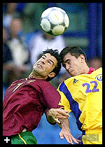 For a game that pitted the so-called "Maradona of the Carpathians" -- Gheorghe Hagi of Romania, against "Europe's Brazilians" promising attacking soccer, it turned to be a drab affair with the Romanians stifling Portugal's free-flowing game and offering little in return. Portugal set the European Championship alight Monday when Figo, Rui Costa and Joao Pinto dazzled England to turn a 2-0 deficit into a famous 3-2 win. Romania drew 1-1 against Germany in its opening bout. England and Germany played in Charleroi, Belgium, late Saturday. In front of some 22,000 fans at the Gelredome stadium in this eastern Dutch town, Portugal went forward from the start and in the fifth minute Nuno Gomes sent a low drive wide of the goal while, three minute later, defender Fernando Couto tried a blast from just outside the box. But Portugal was not given half the room the English side had allowed it in the opening mach, with the Romanian defense and midfield fighting fiercely for every ball and committing fouls whenever necessary. By midway through the first half the game was giving signs that it was going to be a long slog. By the 22nd minute, Romania had three yellow cards including one for star player Hagi which axes him from the side's final game against England. Portugal's star Luis Figo, also got sanctioned in the 30th minute for shirt pulling. But while Figo could be seen one minute on the right, the next on the left, back and then forward, Galatasaray's veteran Hagi stayed on the right using minimum energy. After 60 minutes he looked spent although coach Emerich Jenei let him ride the full 90 minutes. In the first half, Hagi had just one attempt at toward goal, a rising long-range attempt which curled past the far right top corner that created little danger. His second shot came in the 64th minute when he thundered the ball into the stands from some 10 meters (yards), rousing cheers from his country's fans. Playing much more aggressively, Romania's first close effort came in the 18th minute when Romania's Ajax winger Cristian Chivu dashed down the left flank and centered the ball for Adrian Ilie who had it taken from his feet by Vitor Baia. The game then ran dry of serious attempts on goal virtually until the four minutes into the second half when Portugal's Dimas chanced a volley from half way into the Romanian half but the ball soared high into the crowd. With Figo tightly marked and Rui Costa not commanding from the midfield as had been expected the Portuguese caused little trouble for the Romanians. Their next effort came in a weak 70th-minute header by substitute Ricardo Sa Pinto following a neat cross from Couto. Romania's Viorel Moldovan sent shudders through the Portuguese fans when his header off a corner kick was barely cleared away in the 51st minute. Cosmin Contra fire a shot from the right wing that Baia was stretched to palm over the crossbar. Lineups: Romania - Bogdan Stelea; Dan Petrescu (63, Florentin Petre), Cristian Chivu, Iulian Filipescu, Gheorghe Popescu, Constantin Galca, Dorinel Munteanu, Cosmin Contra, Gheorghe Hagi, Adrian Ilie (78, Laurentiu Ilie), Viorel Moldovan (69, Ioan Ganea). Portugal - Vitor Baia, Jorge Costa, Jose Luis Vidigal, Fernando Couto,
