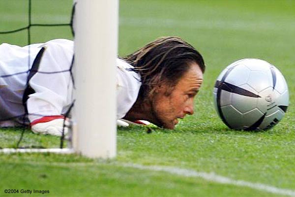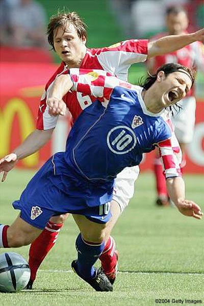 "It would have been better if we had stayed 11-11 because even if we had numerical superiority we were always chasing the ball. "It makes our task against France and England that much harder," said Prso, whose goalscoring exploits for Monaco last season earned him a move to Scottish giants Rangers. Vogel got his marching orders in the 50th minute when he brought down Tomo Sokota and right under referee Lucilio Batista's eyes the 27-year-old PSV Eindhoven midfielder kicked the ball away after the freekick was awarded against him. Ivica Mornar was the next player to go into the book as he was yellow carded for diving in the area bringing the number of yellow cards to seven and red's to one after just 53 minutes of the match. Sokota had a good chance to finally draw blood as Sokota fed by Niko Kovas turned inside a defender outside the area but his shot from 15 metres out sailed over the bar. The match reached a nadir when Swiss keeper and captain Jorg Stiel missed a backpass and had to race back to stop it going into the goal, literally stopping the ball with his head. He was to receive the eighth yellow card minutes later for dissent. The Swiss put together their best move of the match in the 77th minute ending with Benjamin Huggel's rasping shot from 30 metres out being bundled away for a corner in unorthodox fashion by Croatia keeper Tomislav Butina. Both had started brightly as Mornar's sweetly struck freekick was well-taken by Swiss goalkeeper Jorg Stiel and then three minutes later Swiss playmaker Hakan Yakin forced Butina into a save with a shot from outside the area. However the physical side soon took over with Vogel being booked for a foul on Croatia's Niko Kovac and Dario Simic was fortunate his elbow on Alexander Frei by the touchline went unnoticed by the match officials. The Swiss took advantage of a mistake in the Croat defence on the quarter hour mark which let in Frei and though the 24-year-old's cross shot was only parried by Butina Robert Kovac managed to bundle the ball away to safety. Croatia then missed a golden opportunity to break the deadlock. A Swiss ploy to play the offside trap failed completely as from a Croat freekick Stiel was faced with four Croat attackers. He managed to push out Josip Simunic's header and when it came back out to Ivica Olic he could only head it against the bar from three metres out. The Croats, though, had the last effort of the first-half when Niko
