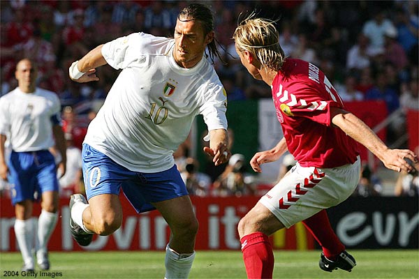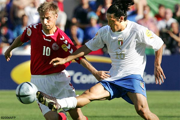 The result means Denmark have now played four European championship finals matches without scoring after their poor showing in Euro 2000. Although Italy had the first chance when Francesco Totti's powerful 25-metre free kick was tipped away by Sorensen, it was the Danes who took the initiative, pushing forward on the flanks and getting early control of the central midfield areas. Italy keeper Gianluigi Buffon was pressed into action in the 16th minute, pushing over a left-foot drive from Helveg who had opened up space by cutting in from the right. Denmark striker Jon Dahl Tomasson was making himself a nuisance for the Italian defence and, although he was booked in the 29th minute for diving, he went close with a flashing header four minutes later and then set up Helveg who fired just wide. BEST CHANCES The best chances for both sides came right on the stroke of halftime with Sorensen making a great double save to foil Alessandro Del Piero and then Totti, both from close range. At the other end the Danes could have gone in with a lead they probably deserved when Martin Joergensen's low shot forced a good save out of Buffon after good work from the lively Dennis Rommedahl down the right. After surviving that scare at the end of a poor first half showing, the Italians were more determined and effective after the interval, creating two good openings straight away. Totti produced a superb pass to put in Gianluca Zambrotta but the left-back shot harmlessly across the face of goal. Then Zambrotta, pushing forward with more urgency, found Christian Vieri with a well delivered cross and Sorensen did well to push the striker's firm header over the bar. Moments later Christian Panucci wasted a chance when, unattended by the Danish defence, he headed wide from a Totti corner. Italy coach Giovanni Trapattoni brought on Gennaro Gattuso for Cristiano Zanetti in midfield and Antonio Cassano for the disappointing Del Piero as he looked to break the deadlock. But Denmark almost caught them on the break when the pacey Rommedahl burst forward and was only stopped by a body check from Fabio Cannavaro which resulted in a deserved yellow card for the Italy captain. The Danes went close to a winner in the 75th minute when Buffon did