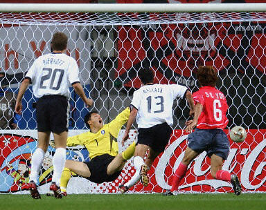 Korea responded immediately as Cha Du-Ri, featuring prominently on the right, squared the ball across the face of the box for Lee Chun-Soo to hit firmly but Oliver Kahn produced an excellent save diving full length to his right (8¡¯). Another lightning fast Korea break ended up with Park Ji-Sung shooting tamely at Kahn from a good position 15 yards out. And, in a lively opening, Germany raced to the other as Bernd Schneider volleyed well from 20 yards but too close to Lee Woon-Jae (17¡¯). Germany were beginning to get on top and the best move of the first half saw Oliver Neuville race in on goal but again the Bayer Leverkusen striker was unable to get his final shot away (30¡¯). A well worked corner was hit to the back post where Marco Bode headed it into the goalmouth before the ball was cleared with difficulty as Korea¡¯s defence stood firm under the barrage of pressure (38¡¯). It was Miroslav Klose next. The striker, with five headed goals already in the finals, turned on the edge of the area but his right foot shot was blocked by an increasingly desperate Korean defence (41¡¯). The Mannschaft came agonisingly close to the goal their pressure deserved, but, almost by the will of the boisterous Red Devils crowd, the ball from the whipped in left wing corner evaded three German players as the half drew to a close (43¡¯). Germany had the opening chances of the second period with Bode coming close with headers twice. First after a tantalising cross from the right by Klose and then from the ensuing corner, but on both occasions the striker was unable to get enough power on the ball (49¡¯). The game was opening up more with Korea gaining more possession but it was a header by Klose that came closest to breaking the deadlock (63¡¯). Ahn Jung-Hwan, on as a substitute, took a chance on the right edge of the box, but sliced his shot high and wide (64¡¯). Chances were becoming more frequent now amidst the crowd¡¯s relentless chant and Klose should have done better when volleying the impressive Ramelow¡¯s chipped pass well wide (65¡¯). The Taeguk Warriors had their best spell of the match and only a Michael Ballack foul on the edge of his own box prevented what looked like a clear scoring opportunity (73¡¯). The yellow card means that Germany¡¯s star midfielder will miss the final. But just moments later it was that man Ballack who finally broke through for Germany. Good work by Neuville down the right ended with a pull back to the onrushing player, who slotted home at the second attempt (1:0, 75¡¯). A free kick from Bode almost doubled the lead for Germany but Lee Woon-Jae, who had been magnificent throughout the tournament, punched the shot away diving to his left (80¡¯). Korea had a late chance when Park Ji-Sung sliced