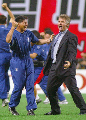 The scare sparked Italy into life. They began to dominate possession with both Francesco Totti and Alessandro Del Piero looking dangerous. The Azzurri got their reward when Christian Vieri leaped highest to head in a Totti corner at the near post. It was his record-equalling ninth goal for Italy in the tournament and fourth of this championship (0:1, 18¡¯). The response to the goal did not come from Korea but rather by Italy, who chose to sit back catenaccio-style on their lead waiting for Korea to attack. The tactic paid off for a while with the only chance falling to Ahn. He spun on a pass from Ji Sung Park on the right edge of the box but hit his cross shot inches over the angle of bar and post (36¡¯). Italy almost went two to the good minutes later when the Roma connection Totti and Damiano Tommasi worked a wonderful move. The midfielder ran onto a cute pass through by the No10 but, with only the goalkeeper to beat, was well blocked by the body of Woon Jae Lee (38¡¯). Korea¡¯s Ahn, who plays his football in Italy with Perugia, twice came close to equalising for the co-hosts before half time. First, his 25-yard free kick was deflected just wide (45¡¯). Then, as Korea responded to the huge support, he struck another sweet shot from distance which was smothered by Buffon (46¡¯). It was a scrappy opening to the second half with Italy sitting back and inviting Korea to attack. Despite Italy¡¯s defensive wall, Korea gained a series of free kicks on the edge of the box but they were unable to take advantage. As the crowd created another crescendo of noise, along ball from defence had Vieri clean through. The Internazionale striker, though wasted the gilt-edged chance firing wide with his right foot (74¡¯). And it was Vieri again who went desperately close again. He battled to win the ball back and headed for goal only to see his left?foot strike clip a defenders boot and land on top of the net (77¡¯). Italy were creating much the better chances now and they nearly extended their lead with a tremendous run by Totti. Reminiscent of Roberto Baggio¡¯s goal against Czechoslovakia in Italy 90, the player beat a number of defenders on a run from inside his own half but just when he had a clear shot on goal he wanted to beat the last defender and the chance went begging (79¡¯). Korea hadn¡¯t created a single opportunity in the whole second half but just when it appeared coach Giovanni Trapattoni¡¯s tactics had paid off Korea miraculously equalised with seconds of time remaining. Panucci failed to clear a chip in the box and Seol drilled the ball low into the corner to send the crowd wild (1:1, 88¡¯). In a frantic finish, Italy ran to the other end of the park and Tommasi¡¯s perfect centre was ballooned over the bar by Vieri from inside the six-yard box (89¡¯). Even then there was time for Korea to win the match as substitute Cha Du Ri overhead kicked straight at Buffon (90¡¯) and Park shot into the side netting (91¡¯). Heartened by their late goal, Korea started the first period of extra time the stronger winning a series of corners with Italy unable to escape from their own half. Hwang Sun Hong cleverly shot under the jumping Azzurri wall and Buffon pulled out a miraculous save diving to his left to turn it round the post and save the Golden Goal (102¡¯). Italy¡¯s first forage into Korea¡¯s half brought what could be one of the most talked about decisions of the competition. Totti fell under a challenge in the area and, as Red Devil hearts missed a beat, the referee ran to the Roma player instead of the penalty spot, producing a yellow card followed by a red (103¡¯). Hwang had a glorious chance to give victory to Korea as all alone he headed a left-wing cross at Buffon (111¡¯). After being the hero, Park was so close to becoming the villain after he incredibly tried a back heel in his own area. The ball fell invitingly for Gennaro Gattuso but his shot was superbly saved by Lee from point blank range (113¡¯). And then the Golden Goal, the moment that will