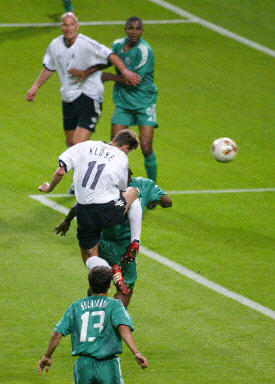 The Germans displayed mechanical timing in the first half, producing three headed goals, all to the left of Saudi Arabian goalkeeper Mohammed Al Deayea from left-side crosses. One goal each from Michael Ballack, Carsten Jancker, Thomas Linke, Oliver Bierhoff and Bernd Schneider filled out the scoring. After Saturday afternoon¡¯s 1-1 draw between Ireland and Cameroon, Germany move to the top of Group E. The Germans asserted themselves right from the start, and Saudi Arabia melted under the onslaught, as Germany cut through the opposing defence time after time. Jancker almost opened the scoring shortly after kick-off when he received a pass in the area with his back to the goal, but his spinning shot went wide of the far post (2¡¯). Germany kept attacking, and Ballack thought he had a gift when a fight for the ball on the edge of the area resulted in the ball rolling out to him in space, but his effort from 20 metres sailed over the crossbar (16¡¯). The inevitable German goal came when Ballack knocked in a cross from the left wing that bounced in the area up to the head of Klose, who directed it into the net to the left of Saudi Arabia goalkeeper Mohammed Al Deayea (1:0, 20¡¯). Germany wasted no time getting their second. Again it was Ballack who sent the cross from the left, and again it was Klose who headed it into the Saudi net, again to Al Deayea¡¯s left (2:0, 25¡¯). The third goal was more of the same but with different names. This time it was Christian Ziege serving from the left, with Ballack heading to the left side of Al Deayea (3:0, 40¡¯). Germany changed up the formula for the fourth goal. The cross came from the right side, Klose flicked it on cleverly to Jancker, who ferociously finished passed Al Deayea (4:0, 46+). With the game already well in hand and with Germany starting to concern themselves more with not picking up bookings or injuries, the Germans still managed to create dangerous situations by repeatedly putting the ball into the Saudi penalty area. Klose benefited from one of those dangerous situations, heading in a cross from the right side for his third goal of the night, the first hat-trick of this year¡¯s finals. He has now scored 11 goals in 13 full international matches. The hat-trick was his third for the German national team (5:0, 69¡¯). Linke got into the scoring act almost before Klose had finished celebrating. Linke rose up to head a corner kick from the right side into the net, the fifth headed goal on the night for the Germans (6:0, 73¡¯). Bierhoff, who had come on for Janker in the 67th minute, also had his chance to celebrate. He ran onto a ball from out of midfield and, as he fell down with a defender in his hip pocket, he fired a low shot into the left corner of the goal from 25 metres (7:0, 84¡¯). Schneider capped off the scoring in injury time