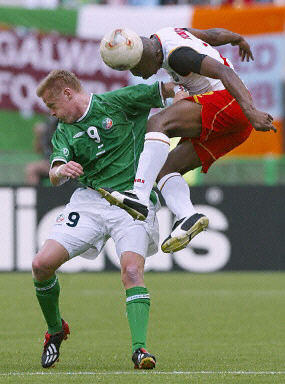 Watched by colourful fans on both sides, it was a match of contradictory halves, as the Indomitable Lions looked far and away the better side in the first. However, Mick McCarthy¡¯s team, without sent home captain Roy Keane, recovered bravely after the break and drew level early in the second half. The Irish will now face group-favourites Germany, while Cameroon take on Saudi Arabia in Saitama on 6 June. A cautious start by both teams produced little in the opening minutes, until Ireland¡¯s Matt Holland dived in hard at Marc-Vivien Foe, getting a piece of the ball but more of the Cameroon midfielder¡¯s right knee (7¡¯). The collision seemed to spark the Africans, as they began to gain an edge in possession. Samuel Etoo created the first real chance of the match when he worked a one-two with Patrick Mboma near midfield to get free. As he raced into the box, charging Ireland goalkeeper Shay Given came out hard to smother the attempt (19¡¯). Etoo produced another strong chance after running onto a lob into the right side of the penalty area. At the corner of the goal box, he turned and lofted a shot over Given, but off target and out for a goal kick (32¡¯). Etoo began to create more danger from that point on and was integral in breaking the deadlock when he beat a defender at the by-line on the right side, and his pass found the foot of Mboma, who easily slotted the ball into the empty net (0:1, 39¡¯). Late in the half, Ireland¡¯s Ian Harte whipped a free kick into the box from the right side that was nearly knocked into the Cameroon goal by defender Rigobert Song, but goalkeeper Boukar Alioum smothered the ball to prevent the own goal (45¡¯). But that was the only real chance allowed by Cameroon in the first 45 minutes, as they did their part to earn the lead going into the dressing room. The hard-working Irish side started the second half in search of an early goal and almost had one when Kevin Kilbane¡¯s glancing header from Ian Harte¡¯s cross skidded wide of the back post (49¡¯). Just after Geremi narrowly missed the far post after winning possession deep in the Irish half, Ireland found their equaliser through Matt Holland. Kilbane¡¯s cross from the left side was only half cleared by Cameroon, and Holland drilled a solid right-footer from 25 metres into the left corner (1:1, 52¡¯). The goal really sparked Ireland and they almost went ahead when a ball played into the goal mouth for Robbie Keane was blocked towards goal by Rigobert Song, and only a desperate dive from goalkeeper Boukar Alioum kept the game level (63¡¯). Through most of the second half, neither side consistently had the better run of play, but Ireland seemed to sense victory as the match drew to a close and gained momentum. Robbie Keane looked to take advantage of some more poor work by the Cameroon defence. Standing at the edge of the penalty area, Keane coolly controlled a driven clearance with one touch, and his quick right-footed drive crashed off the far post (84¡¯). As the clock neared full time, Ireland had another
