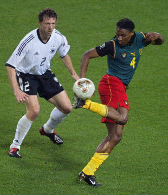 Germany scored two second half goals against Cameroon to end up atop Group E and in the second round. The Republic of Ireland join them in the knockout phase thanks to their victory over Saudi Arabia. The goals came from substitute Marco Bode and Miroslav Klose, who tallied his fifth of the tournament so far, all from his head. It was a foul-tempered match with both teams being shown eight yellow cards and finishing the match a man short. With both teams starting cautiously, Germany proved a bit braver at the outset with Michael Ballack stepping up from midfield to receive a pass from Miroslav Klose before shooting wide (10¡¯). Cameroon weren¡¯t sitting back, however, and they very nearly went ahead when Salomon Olembe was put into the clear from 25 metres. Olembe hesitated as Oliver Kahn charged out of the net and his shot went straight into the keeper. The Marseille man recovered the rebound and his attempted cross was batted toward the goal, but Kahn recovered in time to smother the threat (13¡¯). Kahn was put to the test again on a Pierre Wome free kick from 25 metres on the left side. The German keeper punched clear, but the ball caromed off his own man and out for a corner kick (27¡¯). While still pressuring, Rigobert Song was given a clear opportunity, but his short-range header at the near post went inches wide (28¡¯). Christian Ziege could have put Germany ahead with a free kick were it not for a brilliant save from goalkeeper Boukar Alioum. Ziege¡¯s effort was headed for the top-left corner, but Alioum leapt backward and parried the ball over the crossbar (36¡¯). Though still assured of a spot in the next round with a draw, Germany seemed to grow frustrated as the half drew to a close. Tempers flared on a few occasions and German defender Carsten Ramelow cost his team when he was sent off after collecting his second caution in the space of three minutes (40¡¯). The half-time interval, as well as the insertion of Marco Bode for Carsten Jancker, seemed to come at a perfect time for Germany. Bode broke through the Cameroon defence onto Klose¡¯s perfect pass and calmly placed his shot into the side-netting, giving 10-men Germany the lead (0:1, 50¡¯). The break also seemed to dash all of Cameroon¡¯s momentum, as the Indomitable Lions could not connect on offence and were not able to challenge Kahn as they had in the first half. Cameroon was finally able to generate a second-half chance when a Geremi free kick found the head of Lauren, but his 12-metre shot bounced off the near post. Patrick Mboma raced to the rebound and his sliding shot was straight at the fallen Kahn (73¡¯). The cautions kept flying in the second half and manpower was equalised when Patrick Suffo was sent off (77¡¯). At even strength, Germany quickly went forward and Klose, the tournament¡¯s leading scorer, netted his fifth. Michael Ballack crossed to the back post, where a wide-open Klose knocked the ball past Alioum to all but end Cameroon¡¯s fading hopes for the second round (0:2, 80¡¯). Alioum had not given up though, as he robbed Ballack of a third for Germany when he dived left to save a header from eight metres (88¡¯). Alioum also needed to parry a Jens Jeremies drive from 20 metres in stoppage time (91¡¯). In the end, Cameroon were a defeated side and