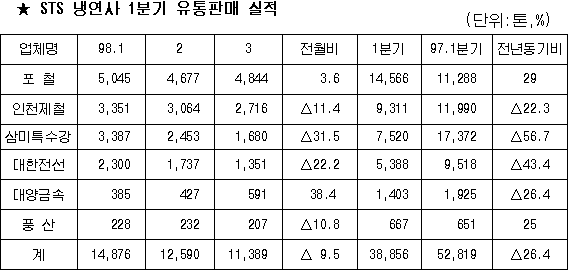 À̿Ͱ°ÀÌ ³Ã¿¬»çµéÀÇ À¯ÅëÆÇ¸Å ½ÇÀûÀÌ °¨¼ÒÇÑ °ÍÀº ºÎµµÁõ°¡¿Í Àü¹ÝÀûÀÎ °æ±â ħü¿¡ µû¶ó ¸ÞÀÌÄ¿µéÀÌ ³»¼öº¸´Ù ¼öÃâÀ» È®´ëÇ߱⠶§¹®ÀÌ´Ù. »ï¹ÌÀÇ 1ºÐ±â À¯ÅëÆÇ¸Å´Â 7,520ÅæÀ¸·Î Àü³âµ¿±â´ëºñ 56.7% °¨¼ÒÇß´Ù. »ï¹ÌÀÇ À¯ÅëÆÇ¸Å°¡ ´ëÆø °¨¼ÒÇÑ °ÍÀº Àü³â ºÎµµ ÀÌÀü ³»¼ö À§ÁÖ·Î ÆÇ¸Å¸ÁÀ» ±¸ÃàÇÏ¿© ±¹³» À¯ÅëÁ¡µé¿¡°Ô °ø±ÞÇØ ¿ÔÀ¸³ª 98³â 1ºÐ±â´Â »ý»êÀÚü°¡ ´ëÆø °¨¼ÒÇ߱⠶§¹®ÀÌ´Ù. ½ºÅ×Àθ®½º ³Ã¿¬»çµéÀÇ 3¿ù À¯ÅëÆÇ¸Å´Â 9.5% ÁÙ¾îµç 1¸¸1,389ÅæÀ¸·Î °¨¼Ò¼¼°¡ µÐȵǰí ÀÖ´Â °ÍÀ¸·Î ³ªÅ¸³µ´Ù. ÇÑÆí 4¿ù ½ºÅ×Àθ®½º ³Ã¿¬»çµéÀÇ À¯ÅëÆÇ¸Å´Â 3¿ù°ú ºñ½ÁÇÑ ¼öÁØÀ»