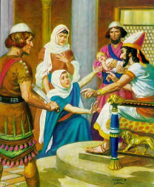3:23Then said the king, The one saith, This is my son that liveth, and thy son is the dead: and the other saith, Nay; but thy son is the dead, and my son is the living. 3:24And the king said, Fetch me a sword. And they brought a sword before the king. 3:25And the king said, Divide the living child in two, and give half to the one, and half to the other. 3:26Then spake the woman whose the living child was unto the king, for her heart yearned over her son, and she said, Oh, my lord, give her the living child, and in no wise slay it. But the other said, It shall be neither mine nor thine; divide it. 3:27Then the king answered and said, Give her the living child, and in no wise slay it: she is the mother thereof. 3:28And all Israel heard of the judgment which the king had judged; and they feared the king: for they saw that the wisdom of God was in him, to do justice.